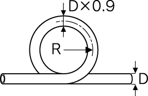しかし、ホースはそうはいかず、まっすぐな時には円形の断面でも、曲げると歪みを起こしつぶれて楕円形のようになります。そのうち限界を過ぎると折れてしまい、断面はつぶれて流体の通り道はなくなってしまいます。ホースが折れずに流体もスムーズに流れる限界の曲げ半径を「最小曲げ半径」と呼んでいます。弊社での最小曲げ半径は、常温下でホースを下の図のように曲げて、ホースの外径が円形時の90%になったときのホースで描く輪の半径Rの数値を指します。