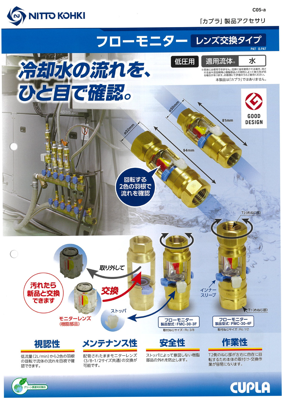 NITTO KOHKI フローモニター レンズ交換タイプのご紹介 2024年6月25日 最終更新日時 : 2024年8月7日 author_no 冷却水の流れを一目で確認。NITTO KOHKI フローモニター レンズ交換タイプのご紹介です。