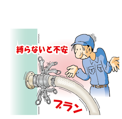 原料搬送工程でアーム式継手カムロックを使用。アームが外れたり、流体が漏れたりする不安があるのでアームを締めたあとは毎回ヒモなどでアームが開かないように縛っている。頻繁にこの作業を行うこともあり、毎回縛るのは面倒。また見た目もよくない。