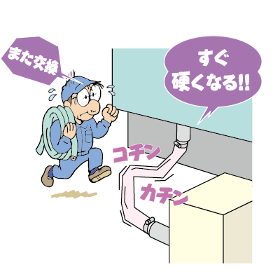 プリント基板を製造している工場で、排水処理過程において、環境汚染対策から排水を処理に適したpH値にしなければならなかった。硫酸や塩酸、苛性ソーダを注入してpH調整を実施していたが、柔軟性の点から採用していた塩ビホースは硬化などで劣化が早く、交換頻度も多くて困っていた。