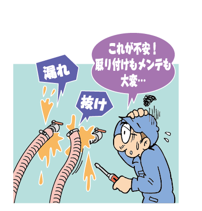 ホースへの挿入が簡単で漏れや抜け防止のレバー式継手のトヨコネクタを実際に試してみた。ホース挿入が容易で取り付け時間を大幅に短縮できた。またホースと同じメーカーが作った継手という信頼性もあり採用を決定。