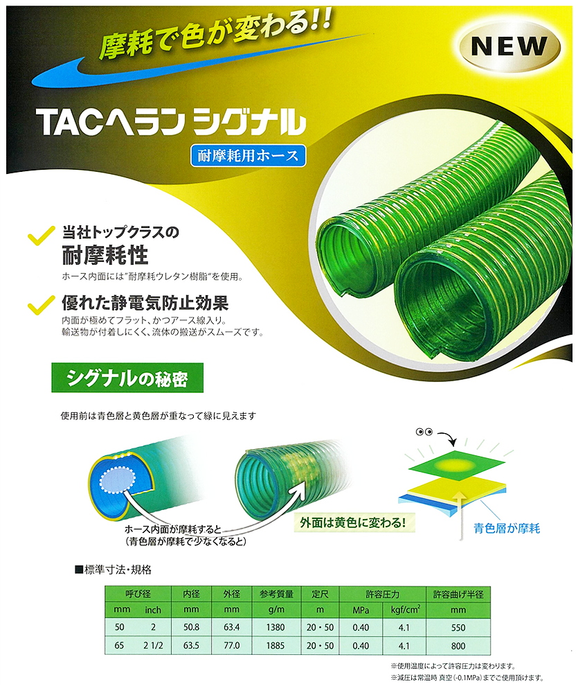 「TACヘランシグナル」のご紹介 2025年9月29日 最終更新日時 : 2025年10月22日 author_no 摩耗によって色が変化するホース「TACヘランシグナル」がいよいよ… 摩耗によって色が変化するホース「TACヘランシグナル」がいよいよ登場します。管が青色層、外管を黄色層にすることで未使用時は緑色に見えますが内管が摩耗することで、青色層が削れ黄色層のみとなり色が変化したホースが交換のタイミングを教えてくれます。 ※製品についてのお問合せは、メール又はFAXにてお願い致します。