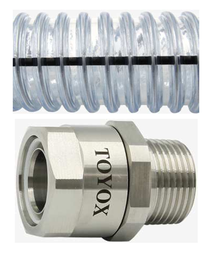 静電気を集積する金属ワイヤーとアース機能を持つ静電気防止帯が一体構造になっており、静電防止効果が抜群の上に100℃までの耐熱性能を有し、高温樹脂ペレット搬送や予備乾燥後のエンプラ系プラスチック粉粒体の吸引・圧送に使用できる‘トヨトップE-100℃’に新たなサイズが加わりました。