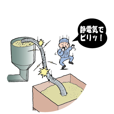 農薬などを製造している工場で、原料の粉体を流すのに、アース入りのホースを使っているのにもかかわらず、ホースを触ると静電気でビリッとくる。原料もホースの内側に付着するなど効率が悪く、大変困っていた。